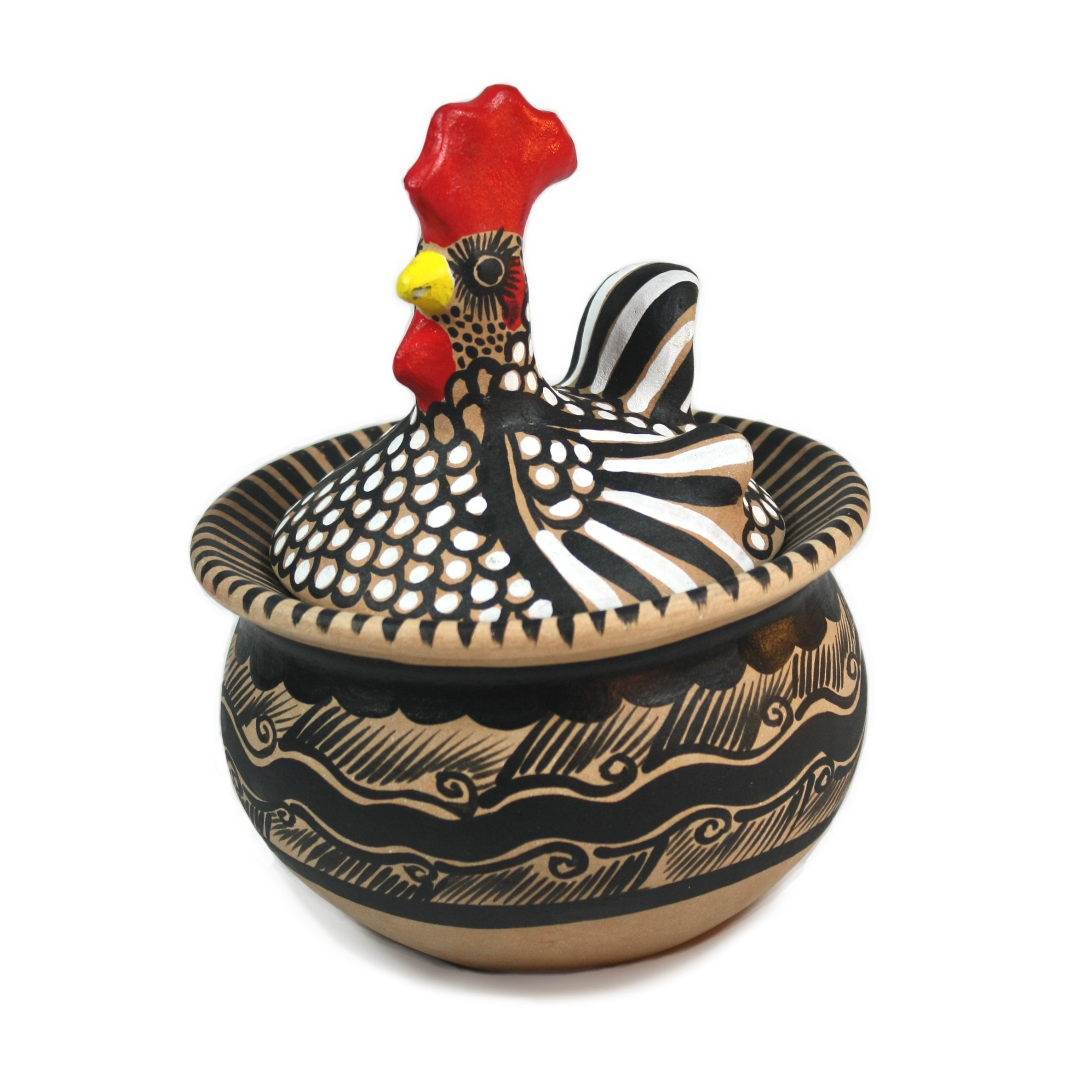 Materiales y técnicas: Barro decorado con pintura acrílica, quemado en horno de adobe